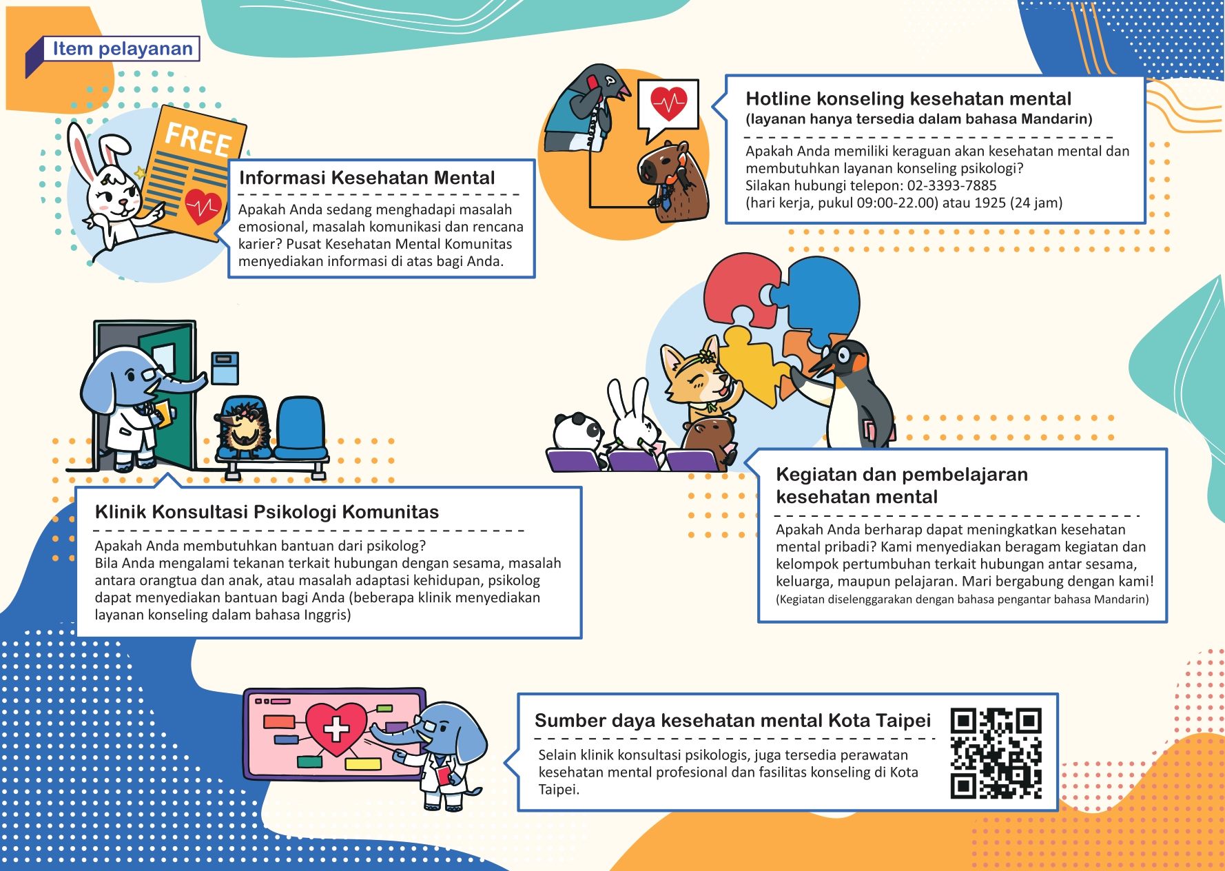 (7) Hotline Konseling Psikologis: (02)3393-7885, jam layanan: hari kerja pukul 09:00–22:00.